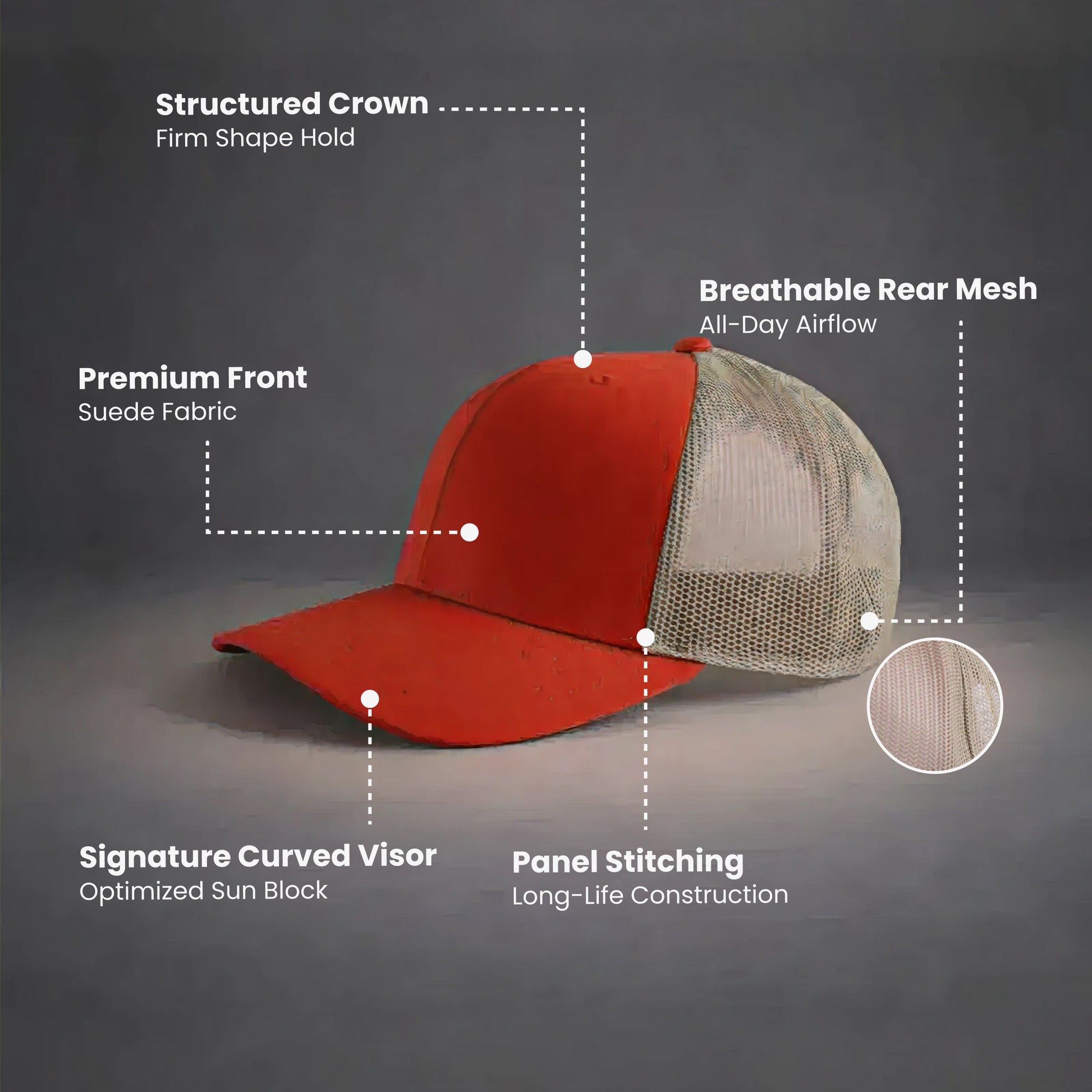 The Burnt Texas Orange Cap stands out with its bold, earthy hue inspired by sun-scorched desert tones. It's a classic trucker-style cap designed to bring together rugged style, breathable comfort, and everyday durability — perfect for those who live boldly and move often.